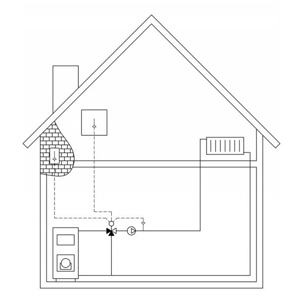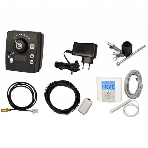 Komplektą sudaro: pavara, adapteris, prijungimo prie maišymo vožtuvo elementų komplektas, vandens temperatūros jutklis su 1 metru laidu, laidinis patalpos termostatas su 15m laidu, lauko temperatūros jutiklis su 15m laidu